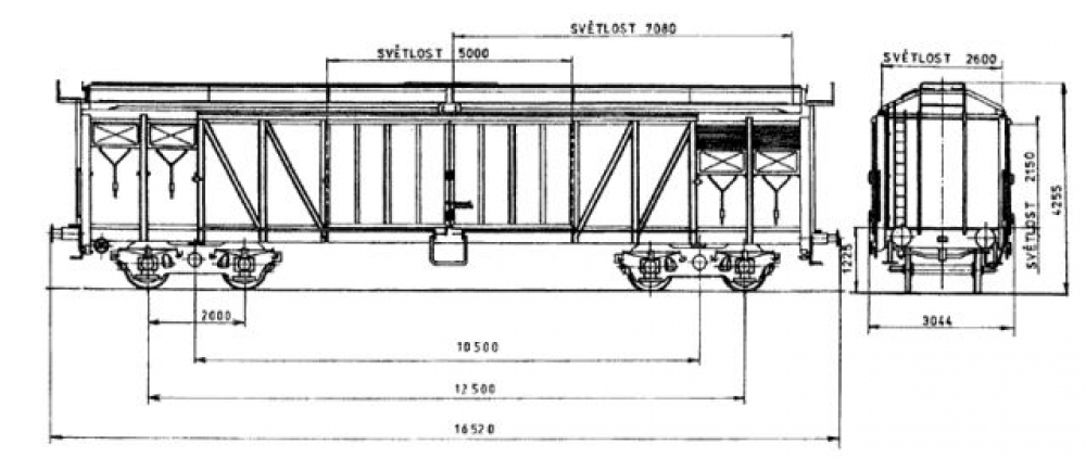 Boční dveře: dvoudílné posuvné směrem k čelu vozu, po otevření světlost nakládacího otvoru 5000 mm, zajištění uzavíracím hákem